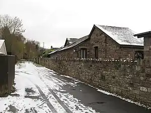 A stone-built low-built station building was provided on the Up platform, with a large station house similar in style to the building at Clydach set back behind it.[10][12] Between the rear of the Up platform and the station house was a single siding which served a small goods yard until after the First World War;[12] another siding to the west of the line served the Wildon Ironworks from 1885 to 1941.[13] Also to the west was a small goods shed and road bridge.[14] A third siding was situated 400 yards (370 m) to the east which led to a wharf on the Monmouth and Brecon Canal until 1953.[15] No. 1 signal box was opened in 1911 near the canal wharf and lasted until c. 1930.[16] No. 2 box was erected at the east end of the Down platform in 1877; it controlled the road crossing to the east of the station.[17]
