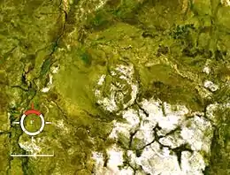 ![]() Landsat image of the central uplift of Goyder crater (circular feature in centre); screen capture from World Wind (scale is 3 km) | |
