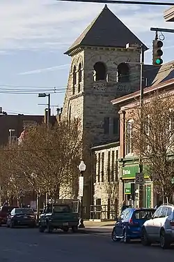 Grace-Hampden Methodist Episcopal Church is a historic Methodist Episcopal church located at Baltimore, Maryland, United States. It is a large stone building constructed in 1899. The Romanesque Revival-style church features multiple gables and a square bell tower and masonry construction utilizing local granite with round-arched openings and decorative sill and lintel courses. It was the first ecclesiastical commission of local architect George Clifton Haskell.[2]