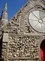 The church is designed in a picturesque Gothic style with 90-foot (27 m) high steeple (square base, octagonal spire), asymmetrical massing, and rough-cut walls of glacial boulder with granite trim. A massive slate roof, in gray with bands of red slate, dominates the nave's low walls and the five-sided apse attached to its east wall.