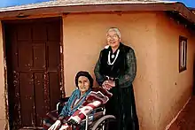 Grace Henderson Nez was born in 1913 in Ganado, Arizona and died in 2006 in Flagstaff, Arizona.[1] Henderson Nez, her daughter Mary Lee Begay and granddaughters Gloria Begay and Lenah Begay are known for their achievements and quality in Navajo weaving. Henderson Nez was born into the Coyote Pass People Clan for the start of the Red Streaked People Clan on the Navajo Reservation in Ganado, Arizona. On the reservation, she lived in a hogan, which can be in various shapes made out of timber, stone, dirt, and bark. The rising sun brings wealth and good fortune, therefore the doors would face east to better capture it.[4][5] Navajo families owned sheep as this was their main food source and served many other purposes.[5][3] The women were tasked with raising the sheep, then at the appropriate time they would use various methods to turn the wool into yarns for weaving.[3]