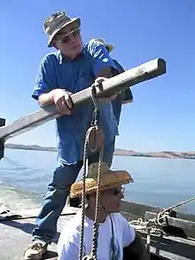 Muir negotiated an agreement between the two parks to build the junk using volunteer labor and redwood lumber for most of the hull, milled from logs donated by a conservation group. Construction began in March, 2003.[5] Traditional Chinese shipbuilding techniques were used, such as flame bending of planks, and edge-nailing using hand forged nails.[5] Joints between the planks were sealed using traditional caulk made by volunteers out of a mixture of lime and linseed oil.[1] This substance is called chu'nam, and also includes organic fibers, such as animal hair, grasses or bamboo fiber.[4]