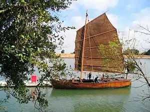 The boat's sail is made of cotton, and is treated with tanbark oak[1] which helps weatherproof the sail, and gives the sail its distinctive tan colour.[1] The sail has six wooden battens, which contribute to its distinctive appearance.