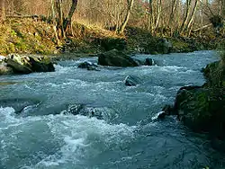 Grajcarek is a minor river, a stream, running between foothills of the Lesser Pieniny and Beskid Sądecki. It starts at Jaworki, as the confluence of the Biała Woda and Czarna Woda streams.[1] The river flows through Jaworki, Szlachtowa, and flows into the Dunajec in Szczawnica, just before the characteristic Kotuńka Rock, at an elevation of 430 metres. After the crossroads of the roads is a bridge, under which flows the river Grajcarek, after which the Pieniny Trail Road begins.[2]