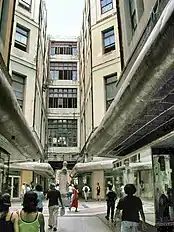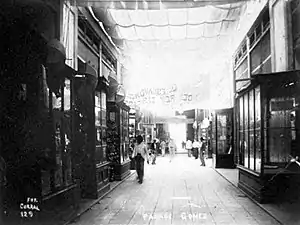 The structure built from 1894 to 1917[9] was the first European-style shopping arcade in Cuba. In certain respects, it recalled the Covered passages of Paris,[lower-alpha 3] The Covered Passage of Paris (French: Passages couverts de Paris) are an early form of shopping arcade built in Paris, France primarily during the first half of the 19th century. By the 1850s there were approximately 150 covered passages in Paris but this decreased greatly as a result of Haussmann's renovation of Paris. Only a couple of dozen passages remain in the 21st century, all on the Right Bank. The common characteristics of the covered passages are that they are: pedestrianized; glass-ceilings; artificially illuminated at night (initially with gas lamps); privately owned; highly ornamented and decorated; lined with small shops on the ground floor; connecting two streets. Originally, to keep the passages clean, each would have an artiste de décrottage (a shit-removal artist) at the entrance to clean the shoes of visitors. The Paris passages were the subject of Walter Benjamin's incomplete magnum-opus Passagenwerk (Arcades Project) which was posthumously published.[11]