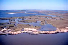 ![]() Aerial view showing eroding shoreline along Rigolets | |