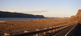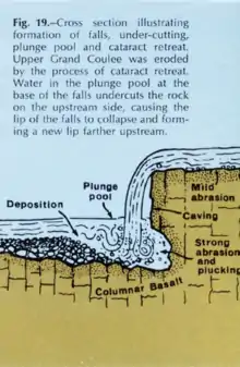 Evidence of the waterfalls includes a plunge basin where the falls began, immediately south of Coulee City. It contains at least 300 feet (91 m) of gravel lower than the open flooring of the land. The river above the falls was shallow and much wider than the gorge. Thus, it wrapped around the lip of the main falls creating lateral falls. These flowed until the recession of the main falls denied them water. Northrup Canyon in Steamboat Rock State Park contains a dry cataract as wide as Niagara Falls and three times as high.[7] Steamboat Rock, 880 feet (270 m) high and a 1 square mile (2.6 km2) in area, now stands as an isolated rise, but for a time it created two cataracts.[7] When the falls passed north of Steamboat Rock, it found a granite base beneath the basal flows. Granite lacks the close vertical joints of basalt and resisted the erosion from the cataract's plunge. It remains as hills on the broad floor of the Coulee.[7] Some gravel-bar deposits are visible along the Route 155. They provide evidence of eddies in the lee of rock shoulders.