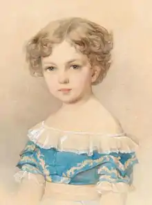 She was nicknamed "Lina" or "Sashenka" within her family. Her father enjoyed having her keep him company while he worked in his study. Her death from infant meningitis at the age of six and a half devastated her parents. Her mother was still brought to tears by the mention of her eldest child decades after her death.[1][2] Her father placed a dried flower from her funeral mass in his diary and marked the page in black to signify mourning.[3] They were thrilled when they had a second daughter, Grand Duchess Maria Alexandrovna of Russia, because they had so missed having a little girl.[4]