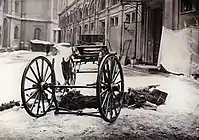 On impact, the carriage horses had bolted towards the Nikolsky Gate, dragging with them the front wheels and coachbox as well as the semi-conscious and badly burned driver, Rudinkin, whose back had been riddled with bits of bomb and stones. He was rushed to the nearest hospital, where he died three days later. Kalyayev, who by his own testimony had expected to die in the explosion, survived.[57][61] Sucked into the vortex of the explosion, he ended up by the remains of the rear wheels. His face was peppered by splinters, pouring with blood.[57] Kalyayev was immediately arrested, sentenced to death, and hanged two months later. The Grand Duchess rushed to the scene of the explosion.[61] Stunned but perfectly controlled, she gave instructions, and, kneeling in the snow, helped to gather up Sergei's remains.[61] The remains were placed on a stretcher and covered with an army greatcoat.[61]