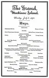 Mackinac Island National Park became the second National Park in the United States in 1875 (before becoming a Michigan State park in 1895). This led to a large increase in visitors to the island.[8] In 1886, the Michigan Central Railroad, Grand Rapids and Indiana Railroad, and Detroit and Cleveland Steamship Navigation Company formed the Mackinac Island Hotel Company. The group purchased the land on which the hotel was built and construction began, based upon the design by Detroit architects Mason and Rice. When it opened the following year, the hotel was advertised to Chicago, Erie, Montreal and Detroit residents as a summer retreat for vacationers who arrived by lake steamer and by rail from across the continent. The hotel opened on July 10, 1887, and took a mere 93 days to complete. At its opening, nightly rates at the hotel ranged from $3 to $5 a night (equivalent to $90.48–150.8 in 2021[9]).[10]