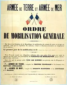The French Chief of Staff, General Joseph Joffre, was convinced of the inevitability of the outbreak of the First World War and, on 30 July 1914, began organising the personnel for his GQG staff.[8] Joffre persuaded the French government to enact mobilisation on 1 August and at 14.00 the next day parliament, following the violation of the French borders by German military patrols, gave Joffre full wartime powers and activated the GQG.[8] The zone of army control was initially limited to just 8 departments of France, but on 10 August was expanded to 33 departments out of 86 in Metropolitan France.[9][10] In this area Joffre was the absolute authority and no civilian, not even President Poincaré or his ministers, could enter it without his permission.[11] Joffre used this authority to exclude the press and his own government's parliamentary commission on military affairs from his zone of control.[9]