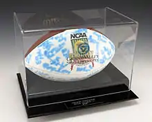 However this playoff run had to be done on the road as GV entered the playoffs seeded third in the Northeast Region.[16] The Lakers opened with a 65–36 win at Bentley College that set up a rematch with SVSU in the Regional Final.[17] The game was a defensive struggle as neither offense could find scoring opportunities. Scott Mackey, GV's All-American DB picked off a pass late in the second quarter to score the game's only touchdown and give GVSU a 10–3 win.[18] The National Semi-Finals saw another new foe for GVSU: Texas A&M-Kingsville. GVSU's offense and defense dominated the game and GV won 31–3 and was off to their third straight NCAA D-II National Championship. A familiar foe was to meet Grand Valley: North Dakota. The game was sure to be a defensive battle as both teams rode their defenses to the title game. GVSU was leading 3–0 in the third quarter, but UND was driving into Laker territory looking for the lead when Lucius Hawkins made the play of the game. Hawkins forced the Sioux QB to fumble, and Lucius returned the ball 59 yards to the North Dakota 20-yard line. All-American Running Back Michael Tennessee scored three plays later and gave GVSU a 10–0 lead. GVSU led 10–3 in the closing minutes as North Dakota was driving. Senior linebacker Mike Hoad picked off a pass on the Laker 10-yard line to preserve the win and give GVSU back-to-back NCAA DII National Championships.[19] The 2003 GVSU senior class etched their names in the record books by becoming just the second team (the other being the University of North Alabama) in NCAA Division II history to make three consecutive trips to title game. GVSU's defense held North Dakota to just 22 yards rushing in the title game, and held three straight playoff opponents without a touchdown. Saginaw Valley State, Texas A&M-Kingsville and North Dakota. The Lakers were the first NCAA DII football playoff team to win four straight road games en route to a championship.[20] The Laker seniors were 47–2 in their final 49 games and tallied a four-year GLIAC record of 34–4.