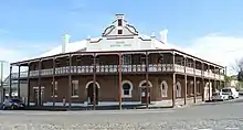 The Grand Western Lodge is a large two storey face brick hotel built in 1901 for John Frape by builder John Wells. Occupying an important site in the centre of town, the Grand Western lodge was built in the hey day of rural development in the district to cater for many visitors, particularly for attending the ploughing demonstrations and competitions. The building is a good example of an Edwardian pub having unusual key hole form windows and pictorial leadlight glazing. The dominant architectural features include the well designed two storey verandah with cast iron balustrading and valance work and the massive stuccoed central parapet.[11][1]