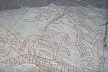 Grani is believed to be depicted on several of the Sigurd stones, which depict imagery from the legend of Sigurd the dragon slayer, including the inscription on Sö 327 in Gök, Södermanland County, Sweden.[2] In Norse iconography, the depiction of a horse carrying a chest was sufficient to represent Grani carrying the treasure after Sigurd had slain the dragon Fafnir.[3] This is supported by a kenning in a Norse poem that refers to "Grani's beauteous burden,"[4] indicating a common understanding of the motif.
