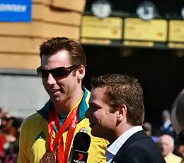In 2004 he was granted the "Key to the City of Gold Coast" in recognition of his outstanding achievement as a swimming champion.[21] He was named as the Australian Swimmer of the Year in 2005, and was also named the World Swimmer of the Year by Swimming World magazine. In 2009 as part of the Q150 celebrations, Grant Hackett was announced as one of the Q150 Icons of Queensland for his role as a "sports legend".[22] In 2010 he was inducted into the Sport Australia Hall of Fame,[23] and the International Swimming Hall of Fame in 2014.[24]