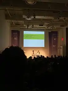 ![]() Grant Passmore and Hito Steyerl presenting their joint work at Rhizome Seven on Seven at the New Museum, May 2016. | |