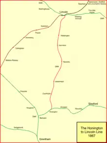 The Grantham and Lincoln railway line was a line in Lincolnshire, built by the Great Northern Railway to shorten the distance between the town of Grantham and city of Lincoln. It had already formed a network in Lincolnshire, but the route from London and points south and west of Grantham was very indirect.