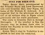 Sir William and Lady Emma were personal friends of the Royal Family. In 1937 Queen Mary stayed at Grantley Hall accompanied by her daughter Princess Mary and her son in law Lord Harewood. The visit was widely reported in the newspapers and one of these reports is shown.[28]