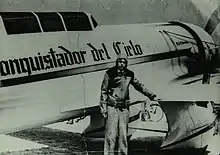 While Francisco Sarabia was taking off with a full fuel load for the return flight to Mexico from Bolling Airfield in Washington D.C., and in full view of his family, his engine failed due to an oily rag having been sucked into the carburettor intake, and he plummeted into the Potomac River, where he was trapped by the collapsed cockpit structure and died before his aircraft could be extricated from the mud of the river bed.[13] The wreckage of his aircraft was recovered and brought back to Mérida, Yucatán where it was placed in a museum.[14] A Mexican postage stamp was issued in his honor in 2000, featuring a picture of Sarabia and the Conquistador del Cielo[15]