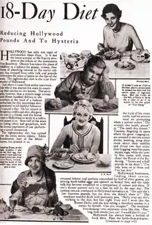 The grapefruit diet originated in the 1930s.[2] It was originally known in 1929 as the "eighteen-day diet", and featured 18 days of grapefruit, orange, toast, vegetable and egg combinations, totalling approximately 500 calories.[3] The originator of the diet is not known. One rumour traces the diet to actress Ethel Barrymore, who is alleged to have paid William James Mayo and his brother 500 dollars to create a special diet for her.[3] The diet then became a fad in Hollywood and spread throughout America.[3] The Mayo Clinic has disavowed the grapefruit diet.[4]
