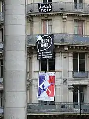 On 11 January 2007, activists from several associations, in particular Droit Au Logement (DAL or transl. Right To Housing), Collectif Jeudi Noir (transl. Black Thursday Collective) and Macaq (abbreviation of Mouvement d’Animation Culturelle et Artistique de Quartier (transl. Movement Cultural Animation and Artistic District)), denounced the inaction of the public authorities in the housing crisis by inaugurating a fake "Ministry of Housing Crisis" in the 2nd arrondissement of Paris, in the corner of Place de la Bourse and rue de la Banque. A poster diverting the logo of the government was displayed by adding a crowbar and a bunch of keys.[29]