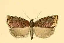 The wingspan is 9–11 mm.[4]The palpi are whitish. The forewings are dull pinkish-ochreous, much mixed and striated with dark brown.The costa is dark brown, strigulated posteriorly with white. The angulated edge of basal patch and the central fascia are darker, between them there is an indistinct paler oblique quadrate streaked dorsal blotch. Some thick streaks from the costa and the margins of ocellus are dark ashy-leaden-metallic, the latter including some blackish marks .The apex and termen are ferruginous - orange. The hindwings are fuscous, darker posteriorly, the cilia in male shortened towards the tornus. The larva is pale pinkish-ochreous ; head light brown.[5]