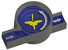 The water passes through a straight inlet and then passes tangentially into a round basin. The water forms a big vortex over the center bottom drain of the basin. A turbine withdraws rotational energy from the vortex, which is converted into electric energy by a generator.[5]