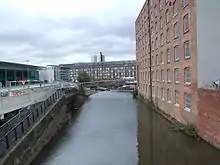 Much of Great Ancoats Street was originally named Ancoats Lane and was the location of Ancoats Hall.[1] The street passed through a thriving manufacturing area during the 19th century. It was in close proximity to the Ashton and Rochdale canals. A number of cotton mills built in the early and mid-Victorian period are nearby, some of which have been converted into residential or office buildings, such as Albion Mill.[2] The Pin Mill Works at the junction with Fairfield Street was a late 18th-century pin works, that became a cotton mill run by J & J Thompson and works for dyeing and calico-printing.[3] Brownsfield Mill, a Grade II* listed building, was built in 1825.