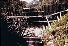 The kauri logging industry was profitable in early European days and up to the mid-20th century. Forests were well inland, with no easy way to get the logs to the sea or to sawmills. Kauri logs were dragged to a convenient stream bed with steep sides and a driving dam was constructed of wood, with a lifting gate near the bottom large enough for the logs to pass through. When the dam had filled, which might take up to a year, the gate was opened and the logs above the dam were pushed out through the hole and swept down to the sea.[12] The logging industry cut down large amounts of old growth, and most of the current growth is younger native forest (around 150,000 kauri seedlings were planted by the New Zealand Forest Service in the 1970s and 1980s) as well as some remaining kauri in the far north of the island.[3][5] Much of the island is covered with regenerating bush dominated by kanuka and kauri.[13]