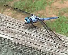 The great blue skimmer (Libellula vibrans) is a dragonfly of the skimmer family. With a total length of 50 to 63 mm, it is one of the largest skimmers. The immature forms of the skimmer are brown in color and mature forms are blue-hued. This species is found near lakes, ponds, and slow streams in the eastern United States[4] and rarely in southern Ontario.[5]