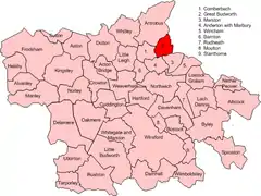 It was situated in the hundred of Bucklow and deanery of Frodsham. At fifteen miles (24 km) in length and ten miles (16 km) in width, it was considered to be the second largest parish in Cheshire, after Prestbury. The parish contained nineteen townships: Budworth, Anderton, Appleton-cum-Hull, Aston-juxta-Budworth, Barnton, Barterton, or Bartington, Cogfoall, Comberbach, Dutton, Little-Leigh, Marbury, Marston, Pickmere, Stretton, Nether-Tabley, Over-Witley, Nether Witley, and Wincham.[6]