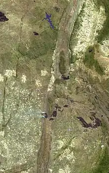 The Great Dyke is a linear geological feature that trends nearly north-south through the centre of Zimbabwe passing just to the west of the capital, Harare. It consists of a band of short, narrow ridges and hills spanning for approximately 550 kilometres (340 mi). The hills become taller as the range goes north, and reach up to 460 metres (1,510 ft) above the Mvurwi Range. The range is host to vast ore deposits, including gold, silver, chromium, platinum, nickel and asbestos.[1]