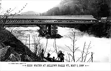 The Great Falls gorge is the narrowest point along the whole river, so it was the site of the first bridge across the river, built by Colonel Enoch Hale in 1785. This bridge was replaced by the Tucker Toll Bridge in 1840, built 15 feet (4.6 m) above the old bridge; the old bridge had come close to being washed away in floods.[3] The Tucker Toll Bridge is visible in the second and third images at the right of this page. Tolls were suspended on the Tucker Bridge after it was bought by the two adjoining towns in 1904.[3]
