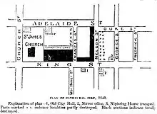 The fire was discovered at 1 a.m. in the rear of Graham's Tavern on the north-east side of King Street and Nelson Street (Jarvis Street) at George, behind Post's Tavern. The fire consumed Post's Tavern then burned through the outbuildings north to Duke Street. The fire spread through the whole block, destroying the Home District Saving Bank and frame buildings to the east on King Street.[2] At this point, a south-easterly wind had come up.[2] The fire was blown across Nelson Street to Rolf's Tavern and consumed all of the buildings of the Market Block south of Duke Street (Adelaide Street) in the block bounded by King Street East, Nelson, Duke and the north-south back lane east of Church streets. At 3 a.m., the spire of the first St. James Cathedral at Church Street caught fire and the cathedral was soon destroyed. The fire spread to the south side of King Street and the 'old' (1831) Toronto City Hall and market building.[3] It damaged most buildings on the east side of Nelson.[4] At its height, the fire was visible from across Lake Ontario in St. Catharines.[2]
