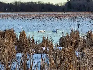 The Concord unit is primarily two small lakes (referred to as "pools" or "impoundments") that are drained into the Concord River every summer. The resulting mudflats provide ideal feeding grounds for many species of shore birds and waterfowl that migrate in mid to late summer. In late July and in August, there will be wide range of birds at these feeding grounds, including various species of sandpipers, killdeer, lesser and greater yellowlegs, and great egrets. Large numbers of great blue herons, ducks and Canada geese are also attracted to these muddy and nutrient-rich feeding grounds.[6]