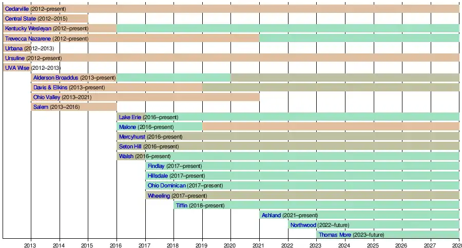 In the fall of 2012, it was announced that Urbana and UVA Wise would spend only one season as active members of the G-MAC. At the same time, the G-MAC announced that three West Virginia schools had accepted invitations to join the conference, starting in July 2013βAlderson Broaddus University, Davis & Elkins College, and Ohio Valley University.[10] All three schools were previously members of the West Virginia Intercollegiate Athletic Conference (WVIAC), which disbanded after most of its football-sponsoring schools announced their departure for a new D-II league that eventually became the Mountain East Conference (MEC).[11] On October 16, 2012, the G-MAC announced that Salem International University, since renamed Salem University, would join the conference on July 1, 2013.[12] Salem would leave the G-MAC in 2016 to become a Division II independent.