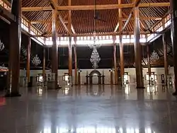 Surakarta Great Mosque is located within a 19,180 sqm complex surrounded by a solid wall. The design of the Great Mosque of Surakarta follows a conservative Javanese architecture principle. It basically consists of two buildings: the main prayer hall and the front hall (serambi). The main prayer hall has seven doors connecting it with the serambi. Four main posts (Javanese soko guru) supported the roof of the main prayer hall. This roof is a pyramidal tajug-styled roof, a type of roof traditionally reserved for sacred buildings in Javanese architectural principle. The roof is three-tiered, topped with a mustaka (rooftop ornament).[1] As a royal mosque, there is a maksura to the left of the mihrab. A maksura is a place for the ruler of the kraton to perform prayer. In case of the Great Mosque of Surakarta, the maksura has a small hip roof.
