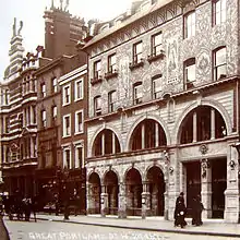 Pagani's restaurant, with its art nouveau frontage by Beresford Pite, was a favourite gathering place for many artists and musicians. This was perhaps due in part to the restaurant's proximity to Queen's Hall on Langham Place. Its Artist Room walls were decorated by over 5,000 notes and signatures of its many important artists of the period[20] who included Paderewski, Puccini, Chaminade, Chevalier, Calvé, Piatti, Plançon, De Lucia, Melba, Menpes, Tosti, Sarah Bernhardt, Whistler amongst numerous others.[25][26] Pagani's was bombed during the Blitz but survived for a time after the war. It had first opened in 1871.[27] The Philharmonic Hall was erected on the site of the new St. James Hall on Great Portland Street in 1907.[28] Sir Ernest Shackleton appeared in person there in 1920 when he presented a film of his Imperial Trans-Antarctic Expedition.[29] Some of the artistic and entertainment energy of the area dissipated after Queen's Hall was destroyed by incendiary bombs in May 1941.[30]