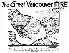 The Great Vancouver Fire destroyed most of the newly incorporated city of Vancouver, British Columbia, Canada, on June 13, 1886.[1] It started as two land clearing fires to the west of the city.[1] The first fire was further away from the city and was clearing land for the roundhouse of the terminus of the Canadian Pacific Railway.[1] The second fire was clearing land to extend the city to the west.[1] The Great Fire occurred shortly after the township of Granville was incorporated into the City of Vancouver.[1]