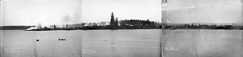 At the Burrard Inlet shore, some residents were able to flee out into the inlet on floats and vessels.[1] The local Squamish Nation provided help to the survivors who were floundering in the water.[8] They paddled over and canoed people to safety.[8] The men of the Vancouver Volunteer Hose Company No.1 went to Scoullar's General Store to remove a supply of explosives, which were taken to the Hastings Mill at the opposite end of town.[1] The city clerk Thomas McGuian saved the city records detailing the city's short history by entrusting them to a stranger.[1]