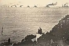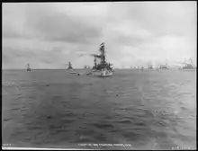 The Great White Fleet was the popular nickname for the group of United States Navy battleships which completed a journey around the globe from December 16, 1907 to February 22, 1909 by order of President Theodore Roosevelt. Its mission was to make friendly courtesy visits to numerous countries while displaying new U.S. naval power to the world. One goal was to deter a threatened war with Japan since tensions were high in 1907. It familiarized the 14,500 officers and men with the logistical and planning needs for extended fleet action far from home. Hulls were painted a stark white, giving the armada its nickname. It consisted of 16 battleships divided into two squadrons, along with various small escorts.[1][2] Roosevelt sought to demonstrate growing American military power and blue-water navy capability. After long neglecting the Navy, Congress started generous appropriations in the late 1880s. Beginning with just 90 small ships, over one-third of them wooden and obsolete, the navy quickly added new steel fighting vessels. The fleet's capital ships were already obsolete compared to the British dreadnoughts in 1907. Nevertheless, it was by far the largest and most powerful fleet that had ever circled the globe. The mission was a success at home and in every country it visited, as well as Europe (which was visited only briefly).[3]