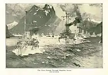 As the Panama Canal was not yet complete, the fleet had to pass through the Straits of Magellan. The scope of such an operation was unprecedented in U.S. history, as ships had to sail from all points of the compass to rendezvous points and proceed according to a carefully orchestrated, well-conceived plan.[1] It involved almost the entire operational capability of the U.S. Navy. Unlike the formidable obstacles that had faced the Russian fleet[nb 1] on its voyage from the Baltic to the Pacific, which eventually led to its destruction by the Japanese in 1905,[21][22] the U.S. effort benefited from a peaceful environment which aided the coordination of ship movements.