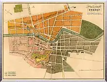 Tartu had lost most of its major stone buildings when they were blown up in September 1708 on the orders of Peter the Great during the Great Northern War. The Russian tsar ordered that the buildings in Tartu (then called Dorpat) should be mined to prevent the Swedes from using the town as a military base.[1] This was just one of the sieges which Tartu was subjected to during its history, but this time the city was left burning and in ruins.[2] When the war finished, the population returned to Tartu, and the desperate need for houses created an abundance of new wooden buildings. The buildings had to be built of wood as the Tsar had laid orders that no stone buildings were to be built anywhere except in the new Russian capital St. Petersburg.[1]