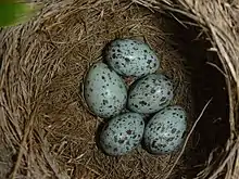Great reed warbler females lay 3–6 eggs in an open cup-nest in reeds. Some pairs of warblers are monogamous, but others are not, and unpaired, so-called "satellite" males still father some young.[17] Great reed warblers defend their nests using graded alarm calls, directed towards a wide range of enemies,[18] although these alarm calls might reveal the whereabouts of the nest to brood parasites.[19]