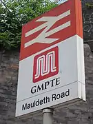 To add to printed material and logos etched in glass on the side of bus shelters, GMPTE began a programme of adding their 'double M' logo to 101 railway station nameboards, train rolling stock livery, bus sides and some 'totem' pole signs outside rail stations in the area during the 1990s. This idea was later extended to a full re-design of the bus stop flag in 2000, (used first on primary bus routes, now extended to the entire GMPTE area) resulting in a unified corporate appearance containing the 'double M' logo on bus, train and tram stops.