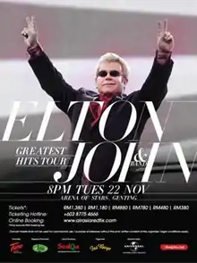 The Greatest Hits Tour[1] was a concert tour by Elton John. The tour started in February 2011 in Victoria, British Columbia, Canada[2] and has visited the Americas, Europe, Asia and Australasia. The tour placed ninth on Pollstar's "Top 50 Worldwide Tours (Mid-Year)", earning over $40 million with 57 shows.[3]