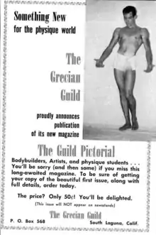Grecian Guild Pictorial was an American physique magazine published from 1955 until 1968. While ostensibly dedicated to art, health, and exercise, like other physique magazines of the time, it was understood that, in practice, its homoerotic photography and illustrations were almost exclusively created by and for gay men. It differed from other physique magazines in its focus on themes and imagery from Ancient Greece, which was seen by many as a coded reference to homosexuality. It has been described as one of the "gayer" of the physique magazines.[2]