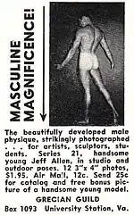 The cover of the first issue of Grecian Guild Pictorial showed the head of Myron's sculpture of a discus-throwing youth against a pink background. Early issues contained a number of commentaries on Greek statuary, and editorial content frequently expressed an admiration of Ancient Greek society, which was "wiser and more sophisticated" than today, and where "the body of a muscular, graceful, well-proportioned youth was among the most admirable of all things."[14] In his views on homosexuality and Ancient Greece, Benson was influenced by Sexual Life in Ancient Greece by German scholar Paul Brandt, which was then the most authoritative source on homosexuality in the ancient world; Benson often quoted Brandt in the editorial content he wrote for Grecian Guild Pictorial.[15]