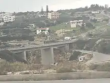 The initial cross section was 11-12.5 meters wide, in the section from Kastelli to Agios Nikolaos and ~ 8 m. in the section from Agios Nikolaos to Sitia, but then a slow lane was added in places with steep slopes.[2] However, the goal of keeping the slopes below 7.5% and the average design speed of 80 kilometres per hour (50 mph) was not possible due to the mountainous terrain, while for reasons of cost reduction, the original design did not include tunnels or valley bridges. The Pantanassa and Paleokastro bridges near Heraklion, 150 metres (490 ft) long each, were built in 1971, instead of landfilling the two respective valleys. The Vrachasi tunnel, 285 metres (935 ft) long, was built in 1971-1973, instead of cutting into loose rocks, with the risk of landslides. The Vrachasi tunnel was the first tunnel in a national highway built in Greece. During its opening, there was a landslide due to loose soil (graphite), but the loose volume was stabilized with cement injections.[2]