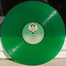Green was released in April 1978 by Virgin Records, only seven months after the release of Motivation Radio.[14] It was originally released as a limited edition translucent green vinyl, before a standard black vinyl edition replaced it a couple of weeks later.[14] The green vinyl pressing also included a poster of Hillage superimposed on a mountain range, with the pyramid fish symbol from the album cover superimposed on his face, and an insert with lyrics and additional album information.[6] The cover features a distinctive "pyramid fish" design by John Michell–an English writer and painter with a particular interest in numbers and geometric shapes. His design is based on the medieval vesica piscis shape–the intersection between two equal sized circles where the centre of each lies on the circumference of the other.[6] The Virgin catalogue number for this album on vinyl was V2098.[6]